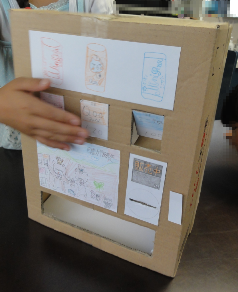 作った自販機でジュースを買うというおままごとをして遊んでいました。